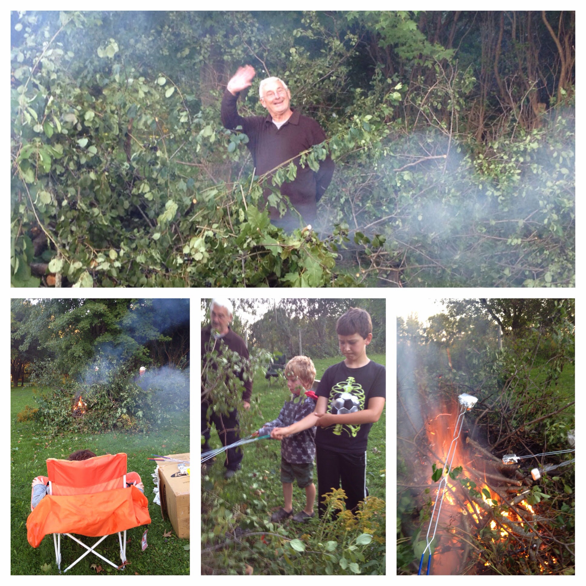 Grandad and I finished clearing, Smallest helped move the branches to the fire pit and then the boys went on the Ipads while Grandma and I made dinner. Today was BBQ burgers, marinated chicken drumsticks, cous cous salad and corn on the cob. We made up some S'mors and took them down the fire where All the boys were lighting, piling, chopping and being boys around the fire. We stayed there until past 8' O'clock. The boys went to bed and we had showers (we were very smelly what with the fire and the mosquito spray).