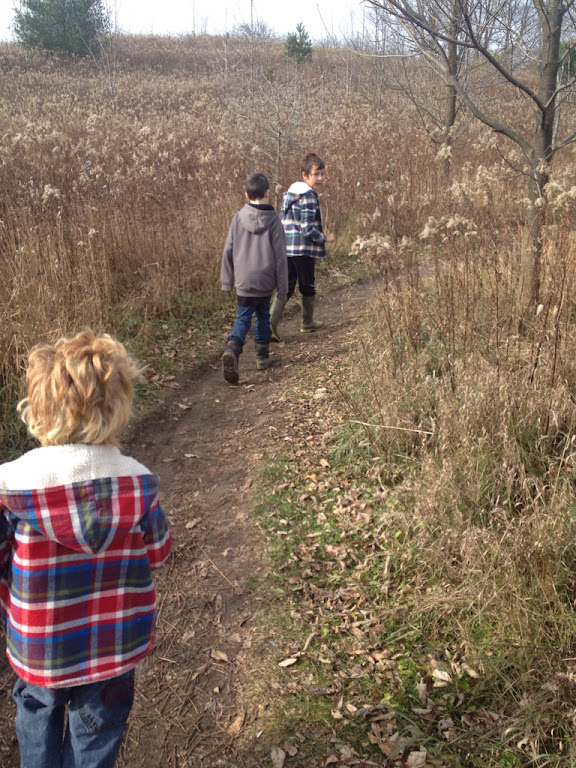 Smallest ran ahead at one point and pretended he was tied to the tree! His hair is the same colour as the leaves!